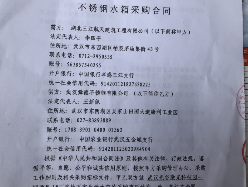 10月10日湖北三江航天建筑有限公司將武漢光谷激光科技園一期項目不銹鋼消防水箱轉包給我公司,并于湖北三江航天建筑有限公司簽訂《不銹鋼水箱定制安裝合同》。湖北三江航天建筑有限公司位于武漢市東西湖區柏泉農場商業街西正街54號,注冊資金為5022.965萬元萬元,聯系人是李四平。目前的經營范圍是房屋建筑工程施工總承包(貳級);市政公用工程施工總承包(叁級);建筑防水工程專業承包(叁級);自有物資設備租賃、房屋租賃。合同約定付定金,工程材料進場安裝完畢做試水合格后三天內付完余款,訂立合同后,武漢舜德不銹鋼水箱廠即按約定期限進場施工,采用包工包料含制作、安裝、水箱基礎槽鋼及水箱配件含法蘭(進水孔管、出水孔管、排污孔管、溢流孔管、透氣孔管、檢修孔、扶梯)以及運輸、裝卸、現場吊裝到位,直至按裝完畢。甲方要求不銹鋼消防水箱焊接要保證無虛焊、無夾渣,焊條選用高于基材型號。表面光滑、無裂紋、焊縫無氣泡,內襯結構排列要勻稱,無毛刺。確保水箱各面保持垂直,垂直度不大于5%,水箱滿載時箱壁無變形、無滲漏。水箱基礎槽鋼架及外梯穩定牢固,經久耐用。我公司于2019年10月15號如約完成該工程的施工,并于2019年15月18號試水合格。我們企業以過硬的質量、超前的技術、細致的服務做保障,真誠的為每一位用戶服務,力爭買一次產品,交長久朋友。著誠信務實、追求卓越、質量為本、科技興業企業精神始終堅持以質量求生存,以信用求發展,以市場為導向,以誠信為原則的宗旨,贏得了廣大客戶的信譽和信任。