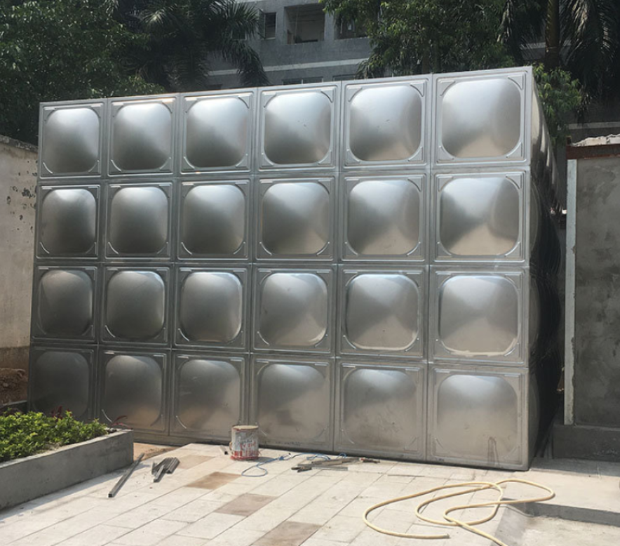雙層不銹鋼保溫水箱板經油壓機模壓成形的標準板塊,分為1000mm×1000mm、1000mm×500mm、500mm×500mm三種。然后根據用戶的規格尺寸由以上三種標準板塊拼裝焊接而成。保溫水箱的容積,完全可以根據客戶要求設計、制造、組裝,容積可在0.125m3至2000m3任意變化。