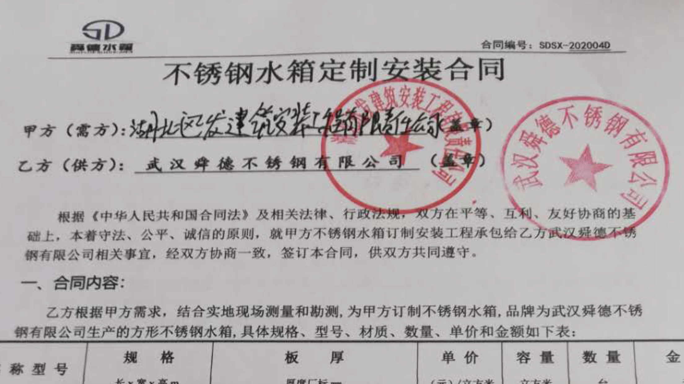5、此水箱容積為20立方米,但武漢舜德水箱有20種規格,供設計選用。用戶可根據設計需要提出水箱的長、寬、高(標準板塊為1m*1m、1m*0.5m)任意組合。安裝現場無別的要求; 外觀整潔、光亮、美觀。